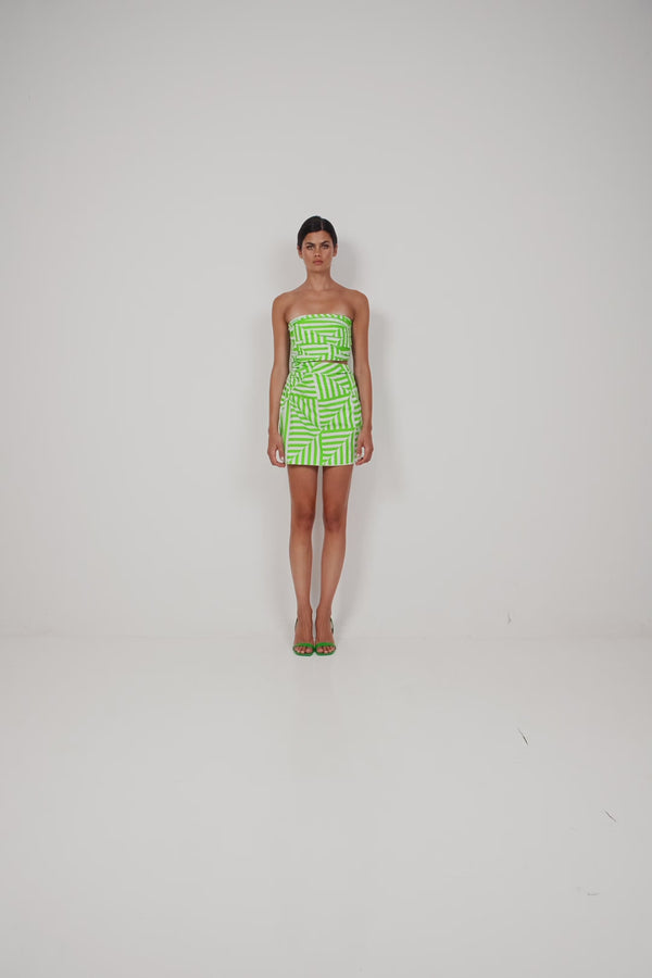 A striking mini designed with an asymmetric waist cut-out that defines and flatters the form. The structured silhouette contours the body, balancing clean lines with a bold, modern edge. A confident statement piece that feels refined and directional.
