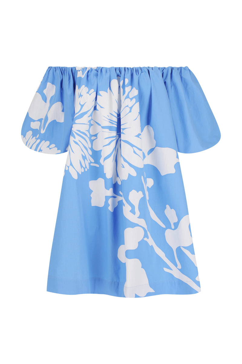 This off-the-shoulder mini dress is crafted from breathable cotton and features voluminous billow sleeves for added drama. The vibrant blue base is contrasted with a bold white floral placement print, creating a striking visual effect. Its relaxed silhouette offers ease of movement, making it a standout option for warm-weather outings or casual gatherings with impact.