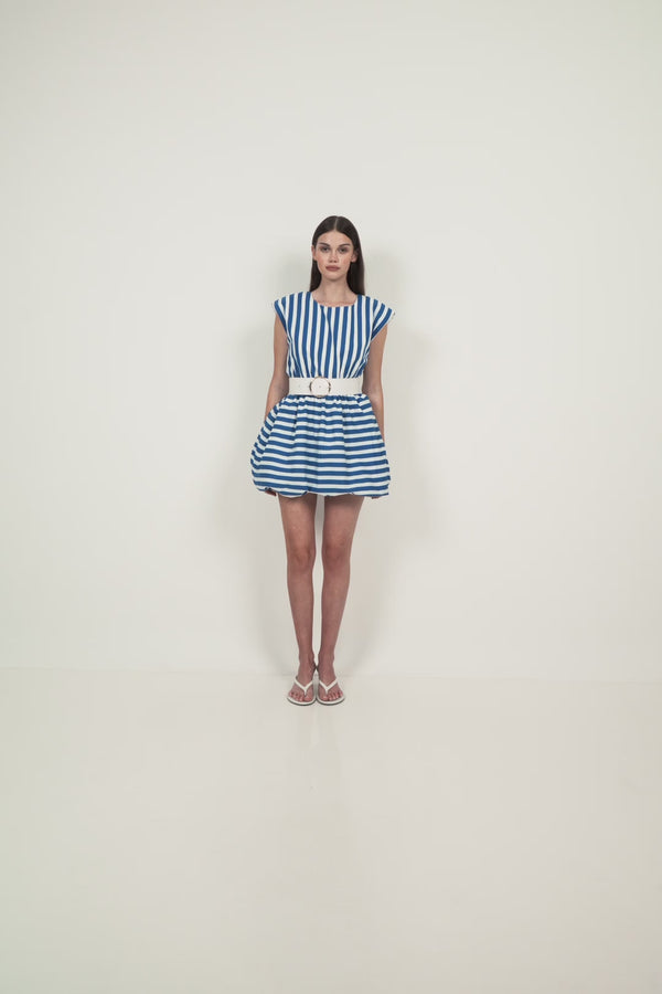 A playful silhouette with structure. Designed with a softly contoured bubble hem, cap sleeves, and a defined waist that balances volume with shape.