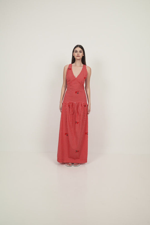 A deep V-neck maxi dress with a dropped waist and flowing skirt. Designed for length and movement with a softly structured feel.