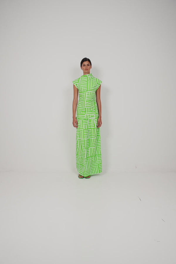 Defined by its structured silhouette and gathered detailing, this maxi dress combines modern lines with soft movement. The high neckline and cap sleeves create balance against the fluid, tiered skirt, giving the piece a refined yet relaxed sensibility. A confident shape with an architectural edge.
