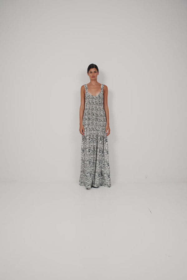 A statement silhouette that fuses texture and flow. The shirred bodice snatches the waist, creating a flattering, sculpted line that falls into a soft, drop-hem maxi skirt. Designed with wide straps and subtle volume through the hem, it moves with confident, feminine energy.