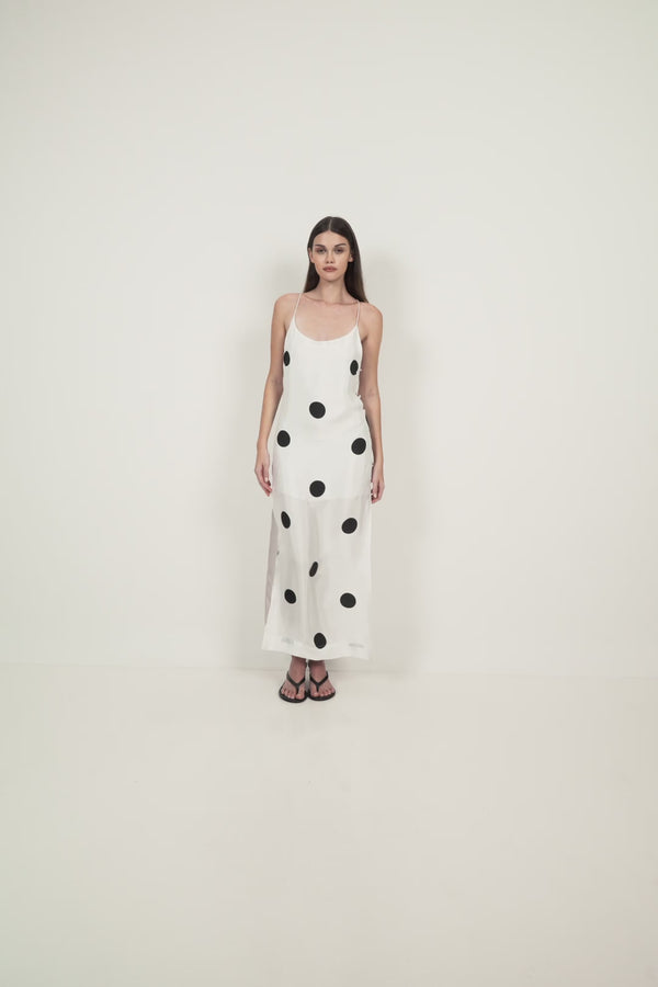A midi-length slip dress crafted from lightweight satin featuring a bold black polka-dot print. Designed with a softly scooped neckline and slender straps, it falls straight through the body for a clean, elongated silhouette. Finished with a side split for ease of movement, this pull-on style offers a modern approach to warm-weather dressing.
