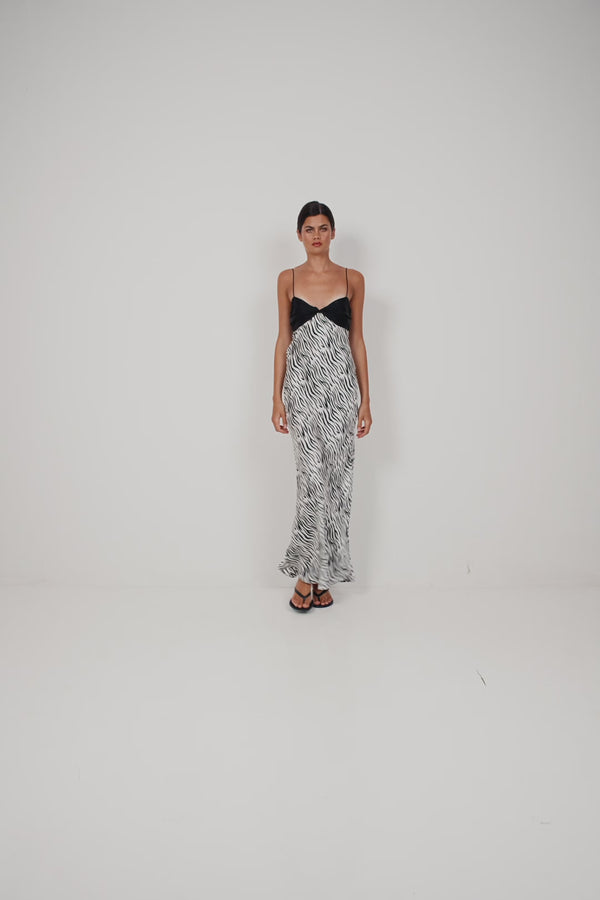 Cut on the bias to trace the body with fluid movement, this satin midi dress features a soft v-neckline framed by fine straps and a contrast bust panel that defines the shape. Designed to drape naturally over the form, it offers an elegant balance of structure and flow.