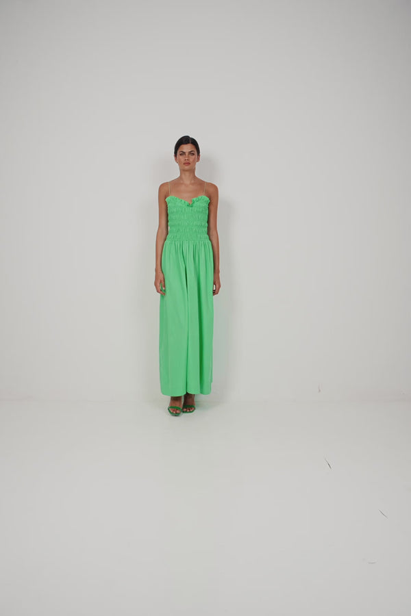 Defined by a softly structured bodice with layered ruffles, this midi balances volume with a slim falling skirt. A shape that feels both playful and refined.