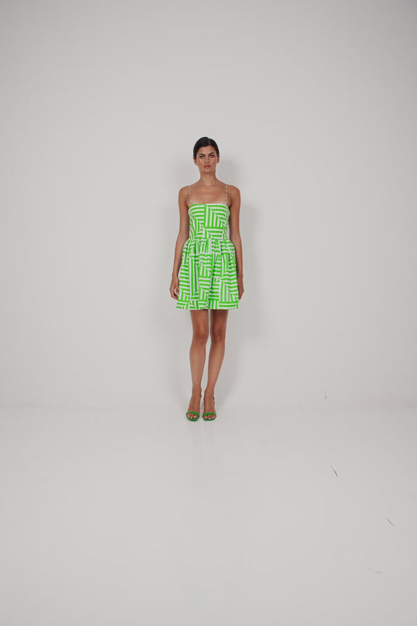 A playful mini designed with slender straps and a structured bodice that defines the waist. The full skirt adds light volume, creating movement and shape. Cut from crisp cotton, it’s an easy, confident silhouette that captures a sense of fun and freshness.