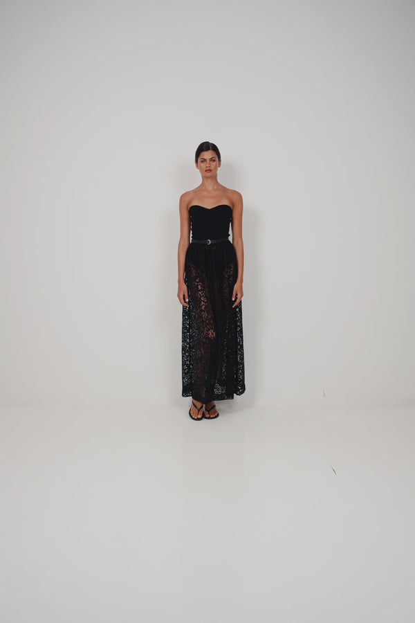 A striking lace combo designed to captivate. Featuring a sleek strapless bodice paired with a sheer lace skirt, this style balances structure and softness. The belted waist defines the silhouette, while the intricate lace adds texture and depth. A confident statement piece with refined allure.