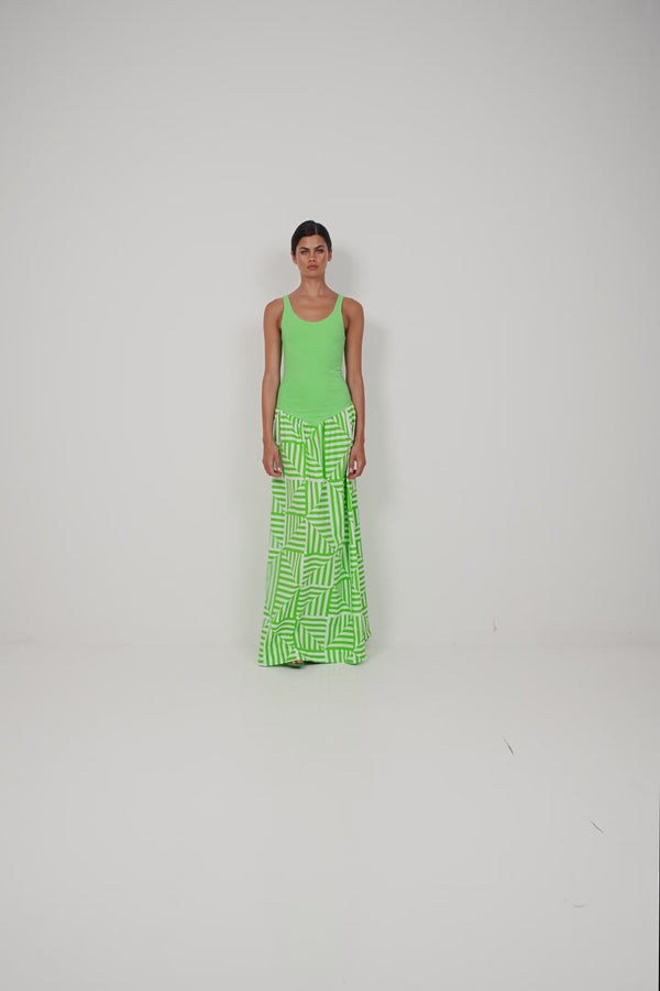 A refined combination maxi designed with a fitted stretch bodice and a softly structured printed skirt. The contrast of textures highlights the waist and creates a flattering, elongated silhouette. A modern shape that blends comfort and form with understated sophistication.