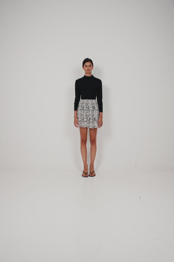 A refined take on contrast dressing. This mini features a fitted stretch bodice that meets a gathered printed skirt, creating a sculpted yet relaxed silhouette. The high neckline and long sleeves bring sleek balance to the playful proportions below, making it a standout shape with a modern edge.