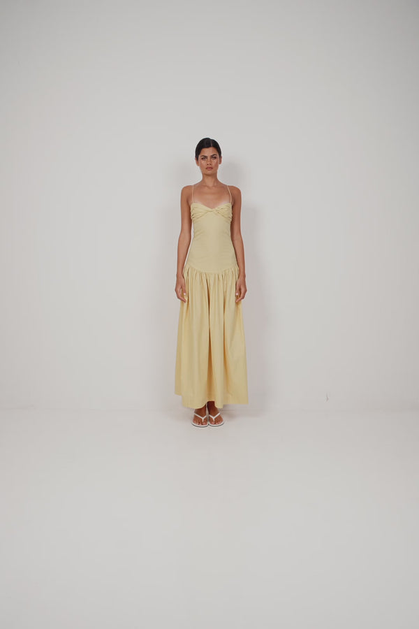 Signature S/W/F! A soft, gathered bust and low waistline shape this feminine midi into an easy, flattering silhouette that moves beautifully. Delicate straps and a fluid skirt add a subtle romantic touch that works from day to night.