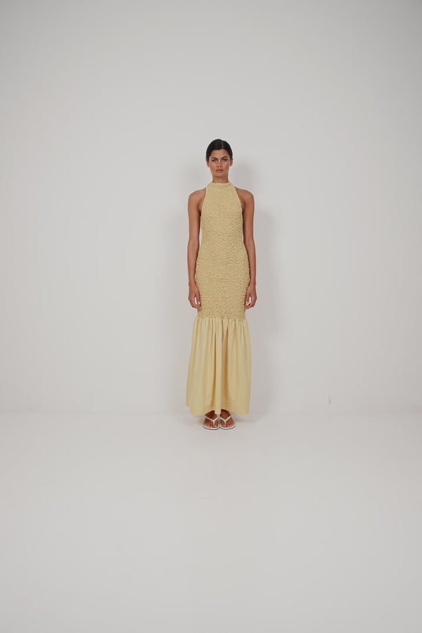 The Mermaid Maxi is designed with a fitted, textured bodice that contours the body before flowing into a soft gathered hem. Its halter neckline and sculpted shape create a striking silhouette that feels modern and sophisticated.