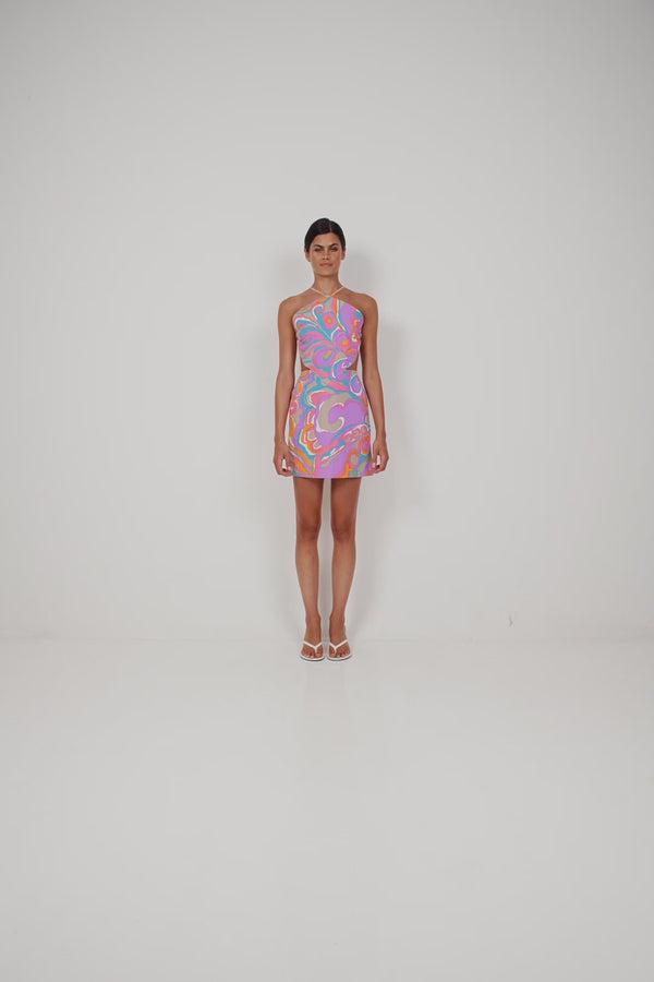 The Scarf style mini features a sculpted, crossover neckline and a contoured waist that defines the body with clean, modern lines. Its structured silhouette creates a confident, feminine shape that feels refined yet bold.