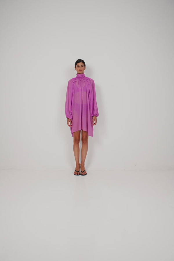 A floaty silk mini with a soft high neckline and voluminous sleeves that drape beautifully. Its sheer finish brings a light, romantic feel made to make a statement.