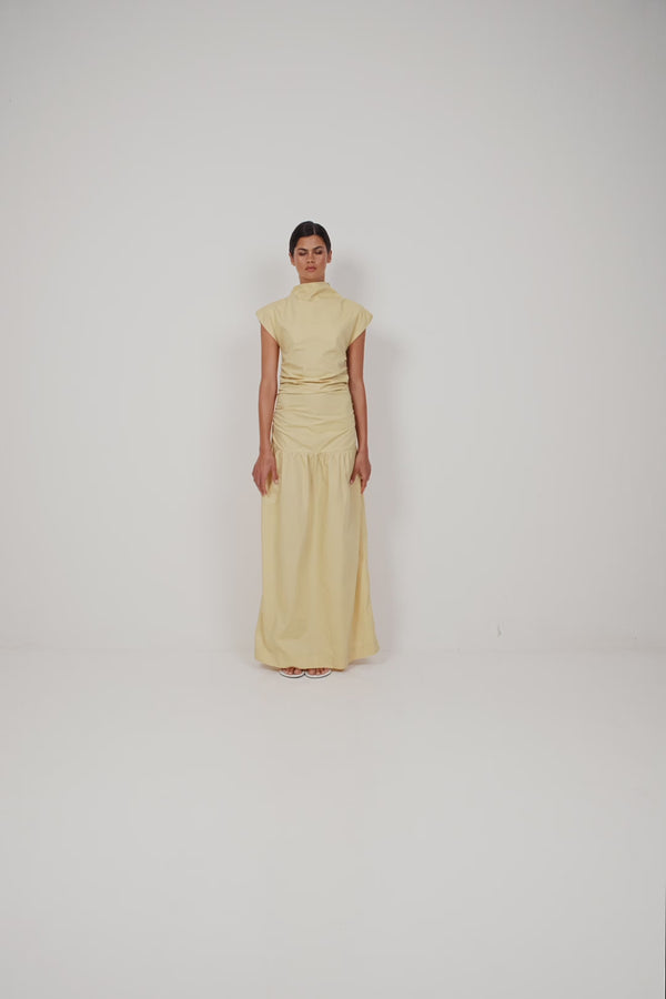 The Structured Ruched Maxi features a high neckline, cap sleeves, and artful ruching through the waist that defines the silhouette. Falling into a softly gathered skirt, it brings a strong yet feminine shape that feels modern and refined.