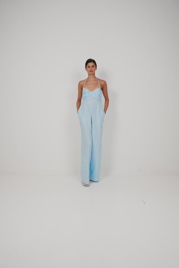Cut from breathable linen, this jumpsuit features a softly gathered bust and slender halter ties that frame the neckline. The wide-leg silhouette falls with graceful ease, creating a flattering, elongated line. Designed for warm days and balmy nights, it pairs effortlessly with minimalist heels or slides for a refined, feminine look.