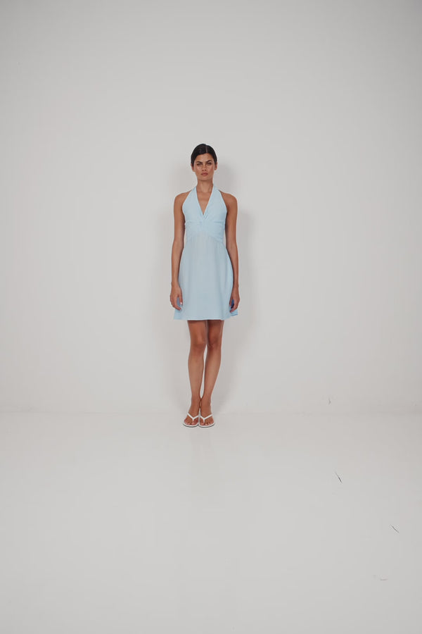The Twist Front Mini features a halter neckline with a soft knot detail that draws the eye to the waist. Its relaxed A-line shape moves with ease, bringing a fresh, playful energy to any occasion.