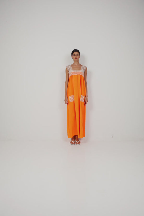 A relaxed, free-flowing maxi designed with a softly structured square neckline and wide lace-trim straps. The gathered bodice creates a gently draped shape through the body, offering comfort and ease of movement. Delicate lace accents add texture at the neckline and front pockets, giving the piece a romantic, handcrafted feel. A warm-weather staple with refined detailing and an airy, graceful silhouette.