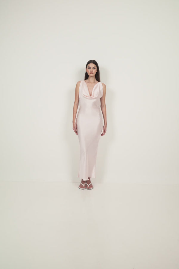 A satin midi dress cut on the bias to follow the natural line of the body. Designed with a softly draped cowl neckline at the front, it falls smoothly through the torso before skimming the hips and legs. The back features a low, open cowl detail with a fine tie at the neckline, offering light adjustability while maintaining a clean silhouette. The fluid satin fabrication allows the dress to move naturally with the wearer, creating an elongated, uninterrupted line. Designed for special occasions and considered moments.
