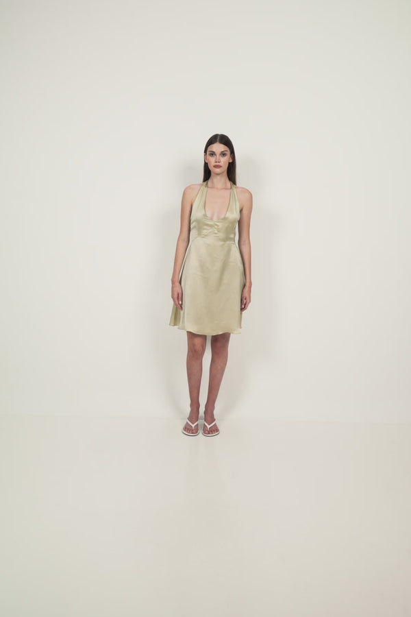 A satin mini dress cut with a plunging halter neckline and softly contoured bodice. Designed with subtle shaping through the waist, it falls into a clean A-line skirt for ease of movement. The open back is finished with a tie closure at the neck, creating an adjustable fit while keeping the silhouette light and fluid.