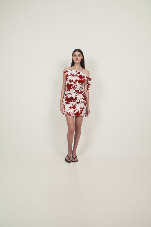 A one-shoulder satin stretch mini dress designed with a fitted, body-contouring silhouette. The neckline is finished with a soft tie detail at the shoulder, creating visual interest while allowing for adjustability. Subtle ruching through the body enhances shape and texture, while the stretch fabrication provides comfort and flexibility. Cut to a mini length, the design is intended for impact.