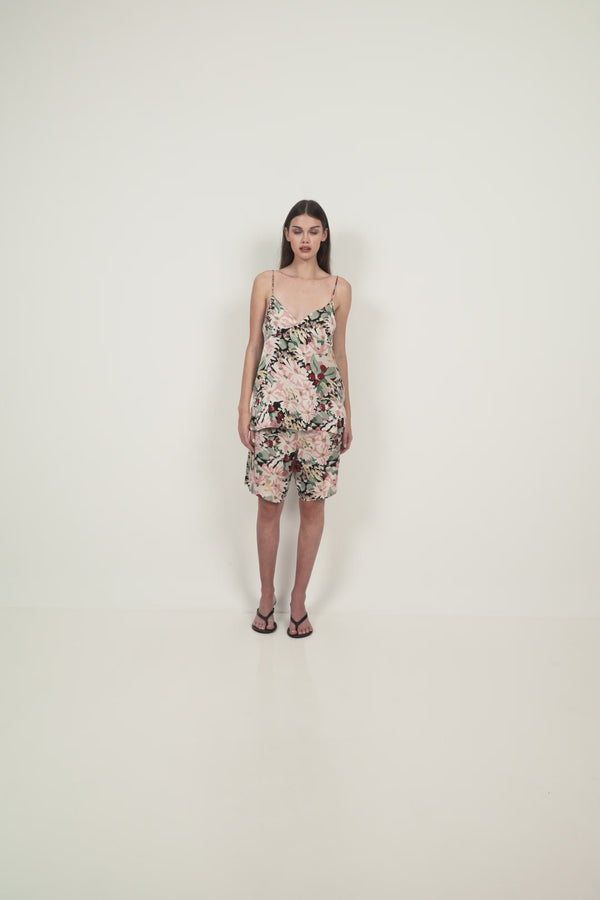 A satin cami designed with a soft draped neckline and a relaxed, fluid fit. Cut with fine fixed straps and a lightweight construction, the silhouette skims the body without clinging. The smooth satin finish enhances the Dust Bloom print, allowing the fabric to fall naturally with movement. Designed for easy styling, the cami pairs well with relaxed bottoms or layered under tailoring.
