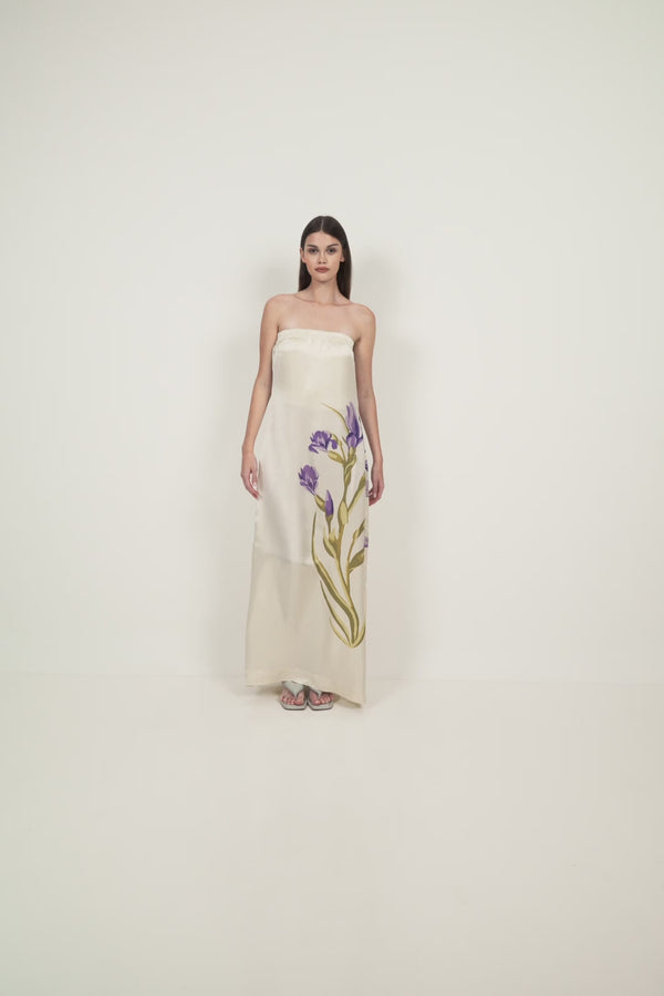 A satin column maxi dress designed with a clean strapless neckline and a streamlined, straight silhouette. Cut to fall fluidly through the body, it skims the frame without excess volume. The elongated shape and minimal construction allow the satin fabrication to drape naturally, creating a refined, uninterrupted line from neckline to hem.