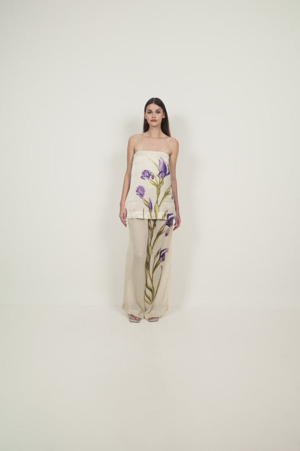 A silk sheer pant designed with a relaxed, wide-leg silhouette and a soft elasticated waistband for ease of wear. Cut to fall fluidly through the leg, it allows the fabric to move naturally with the body. Ideal for layering or pairing back with matching separates.